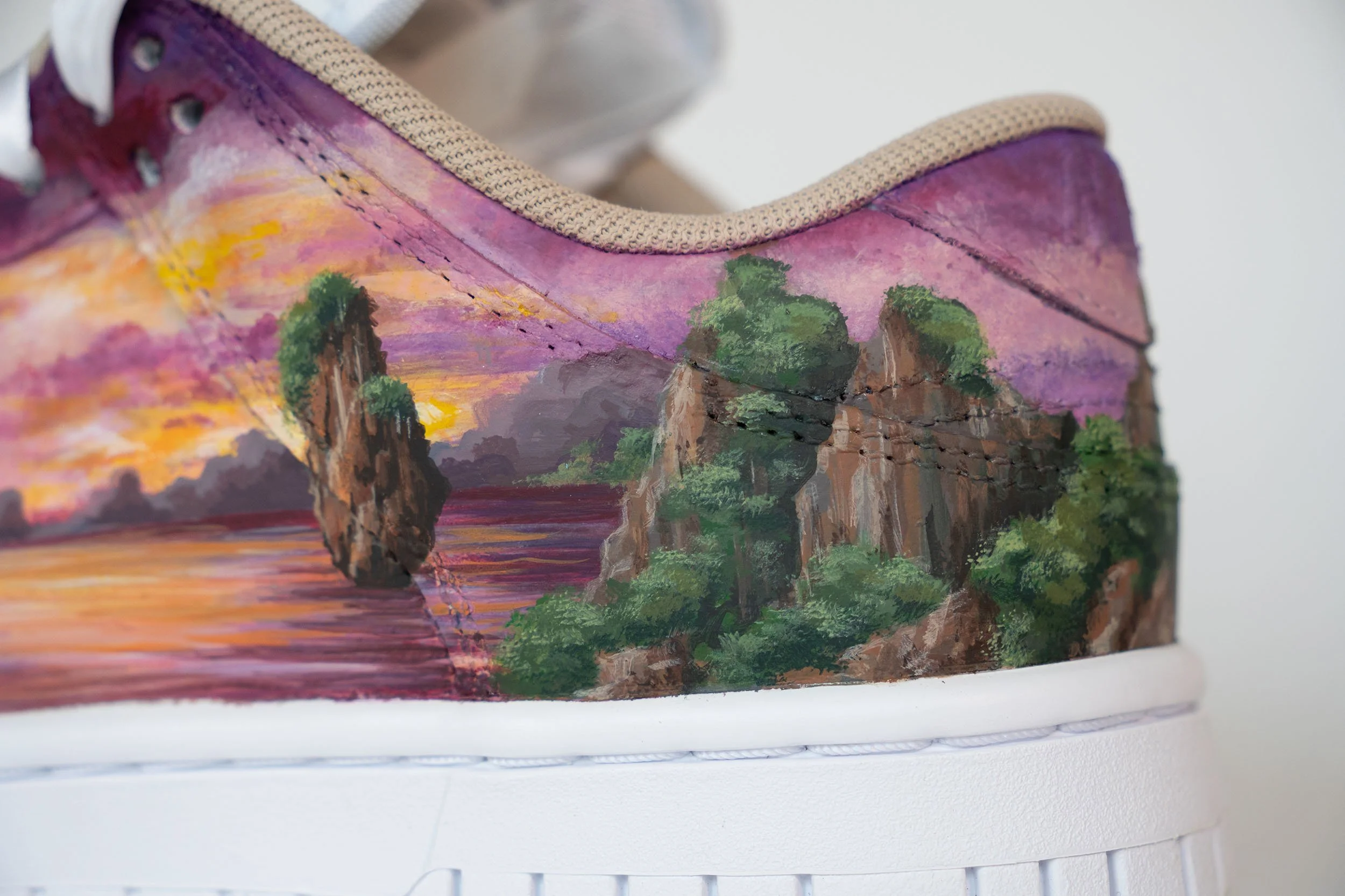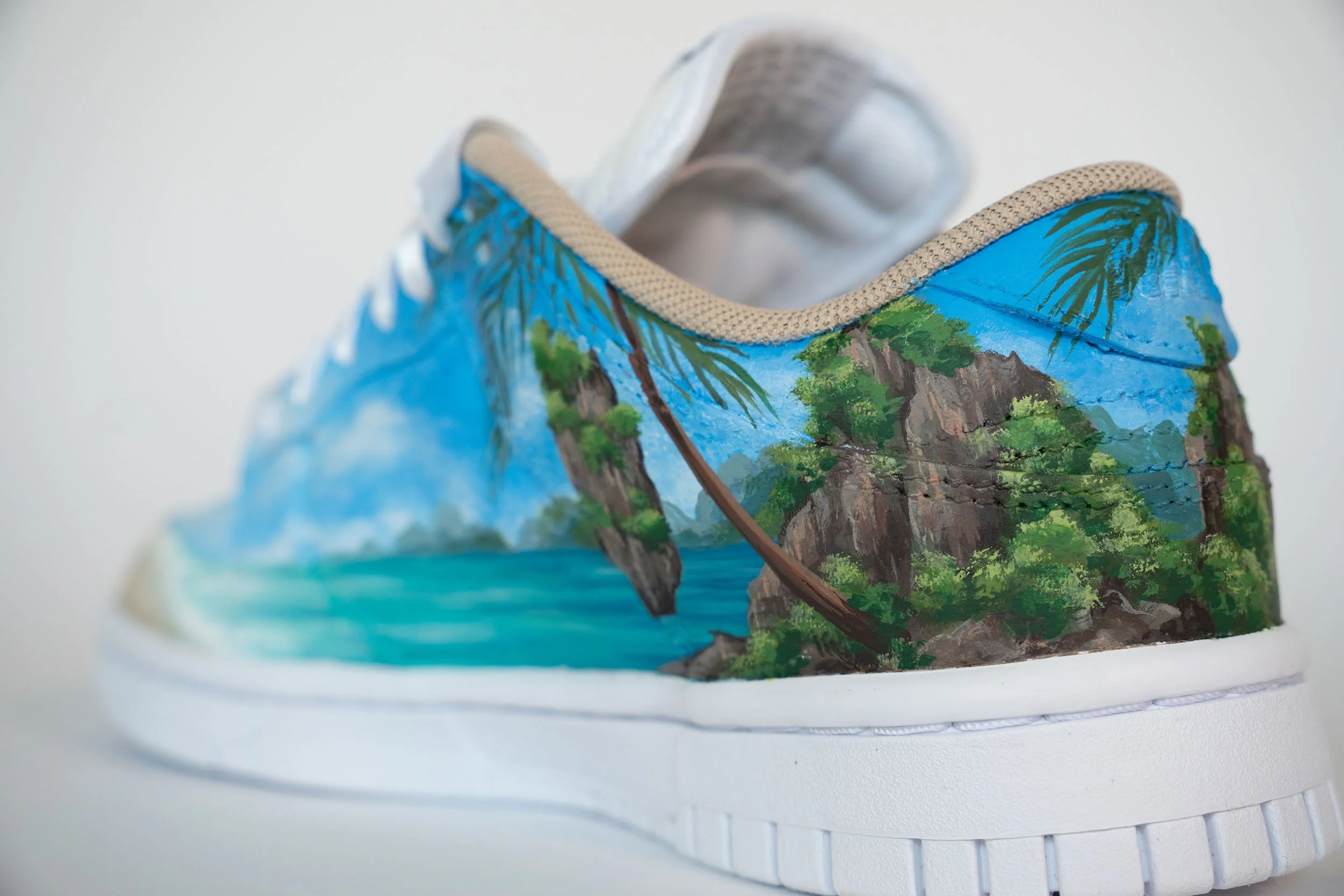These custom Nike Dunk Lows were designed to celebrate a client’s destination wedding in Thailand, incorporating both daytime and sunset scenes to reflect her love for both aspects of the day and capturing as much of the beautiful Thailand landscape as possible, The design was painted as a single, continuous piece that flows seamlessly across every section of the sneakers, transforming them into a cohesive, wearable canvas. This approach allowed the design to feel like a beautiful, uninterrupted masterpiece, making these sneakers not only a meaningful design but also a piece of art that the bride could wear to commemorate her special day in her favorite place.